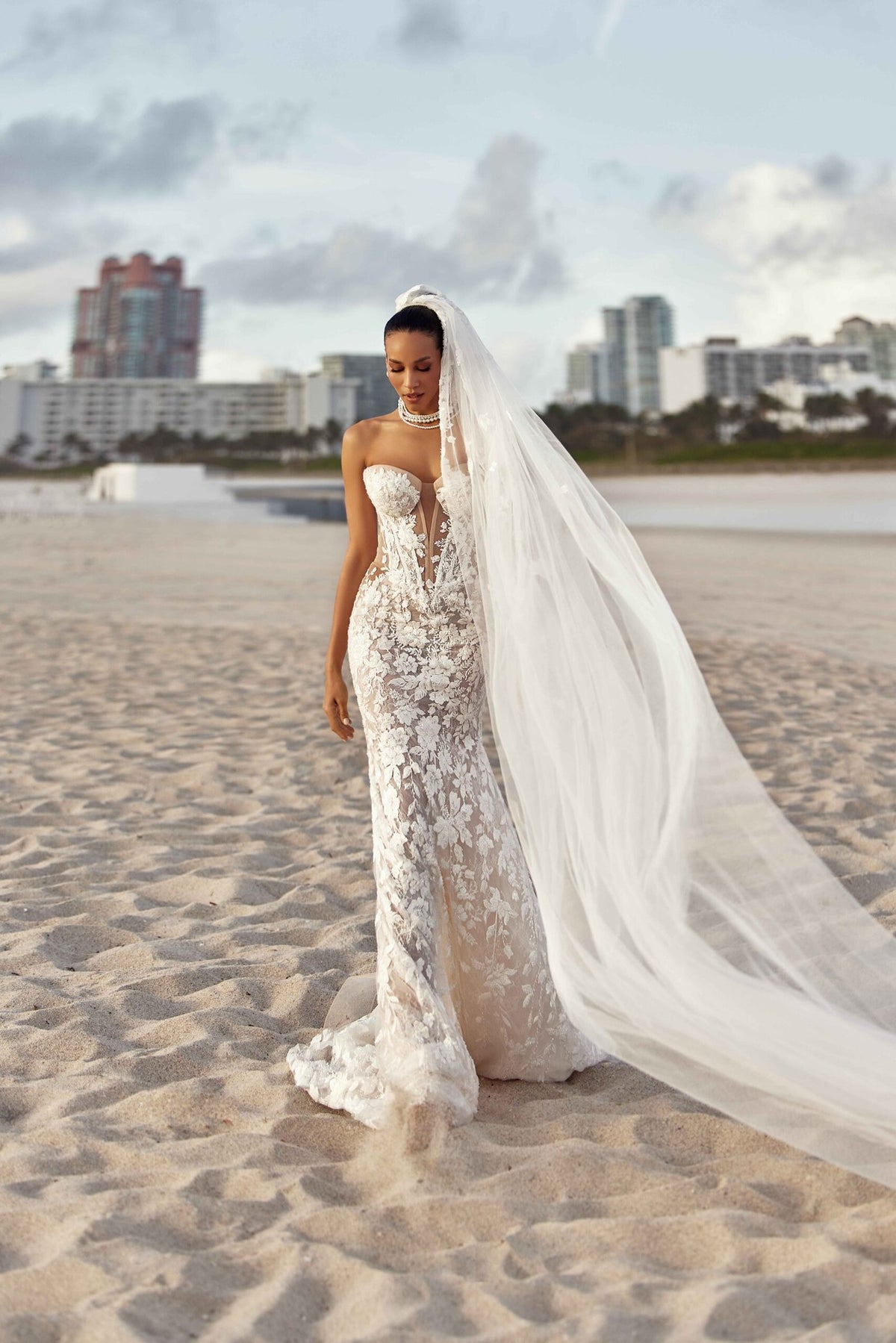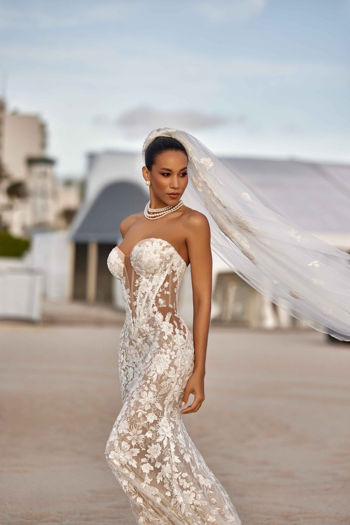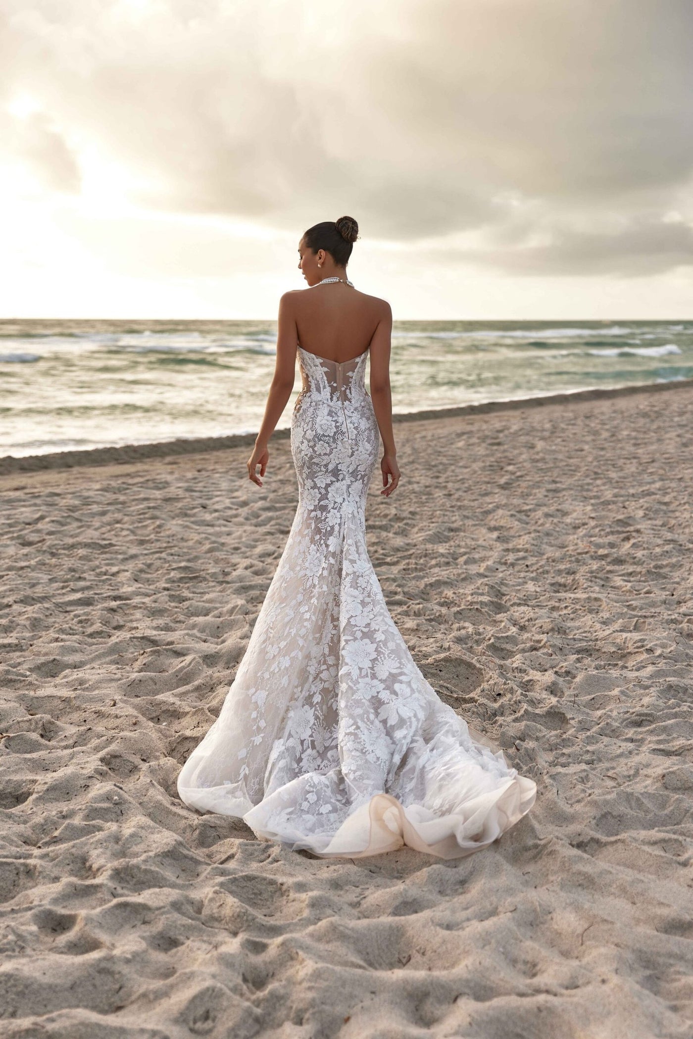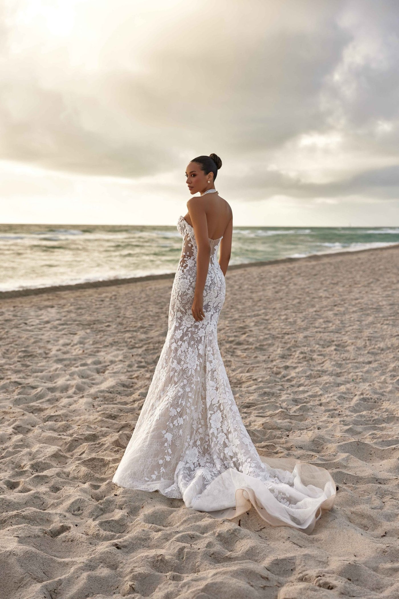 The gown’s fluid silhouette moves like a painter’s brushstroke, flowing seamlessly into sheer, delicate lace that softly reveals the form beneath. Layers of fine, lightweight fabric create depth, mystery, and movement—allowing the dress to come alive with every step.