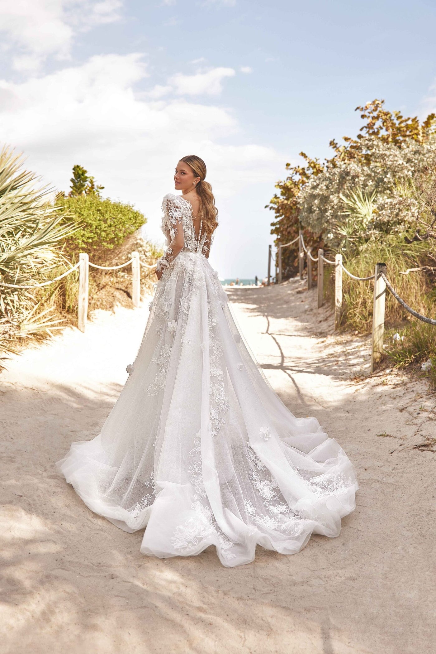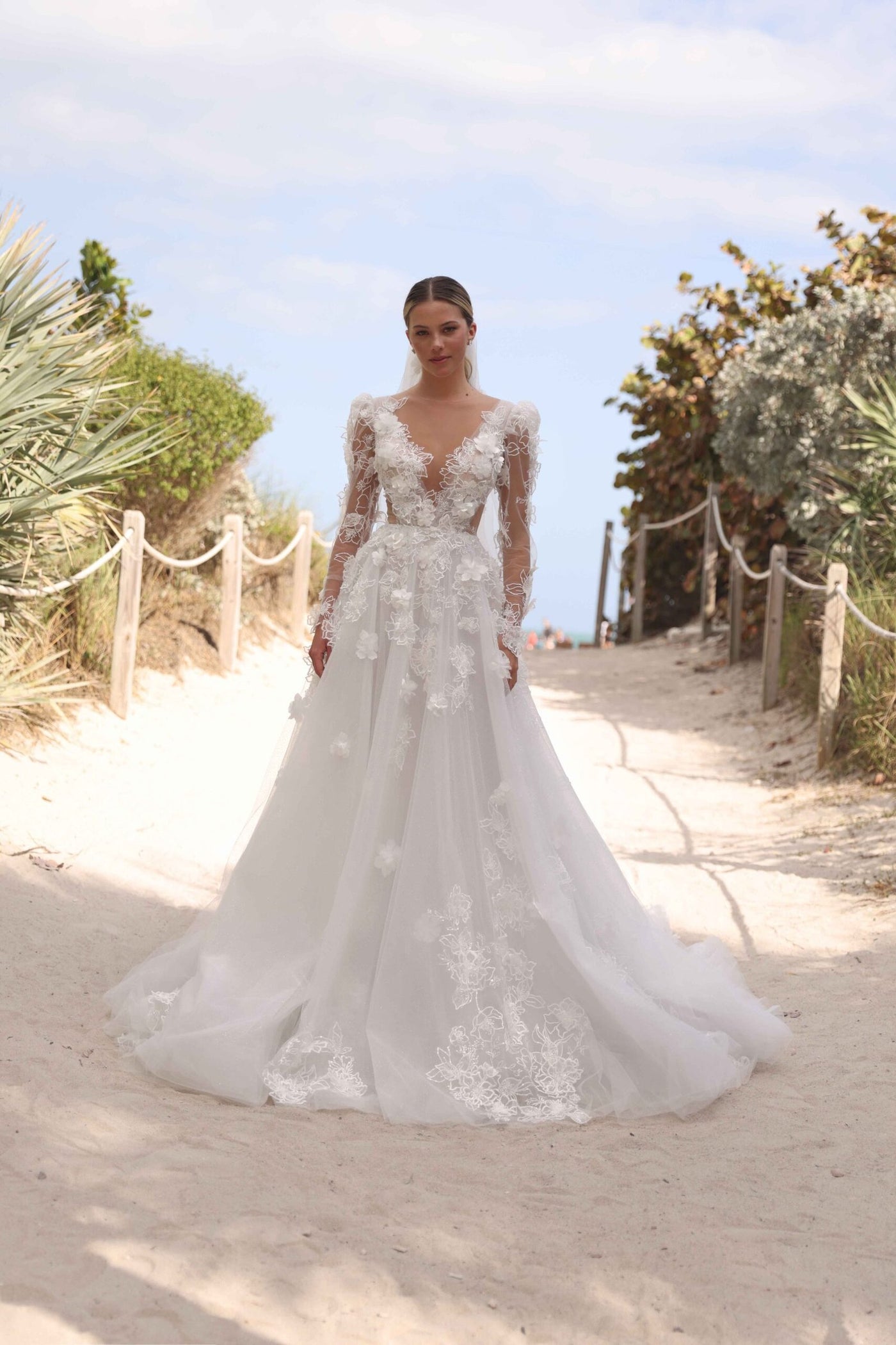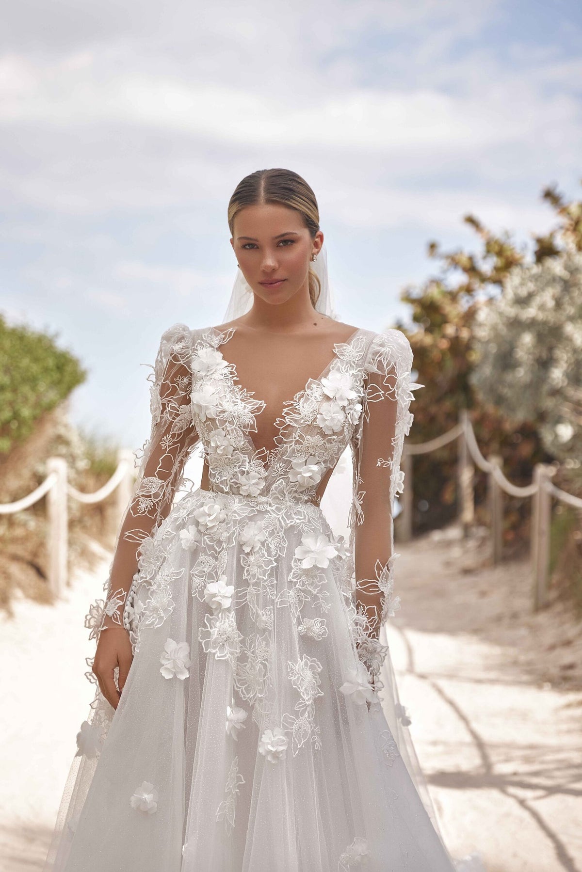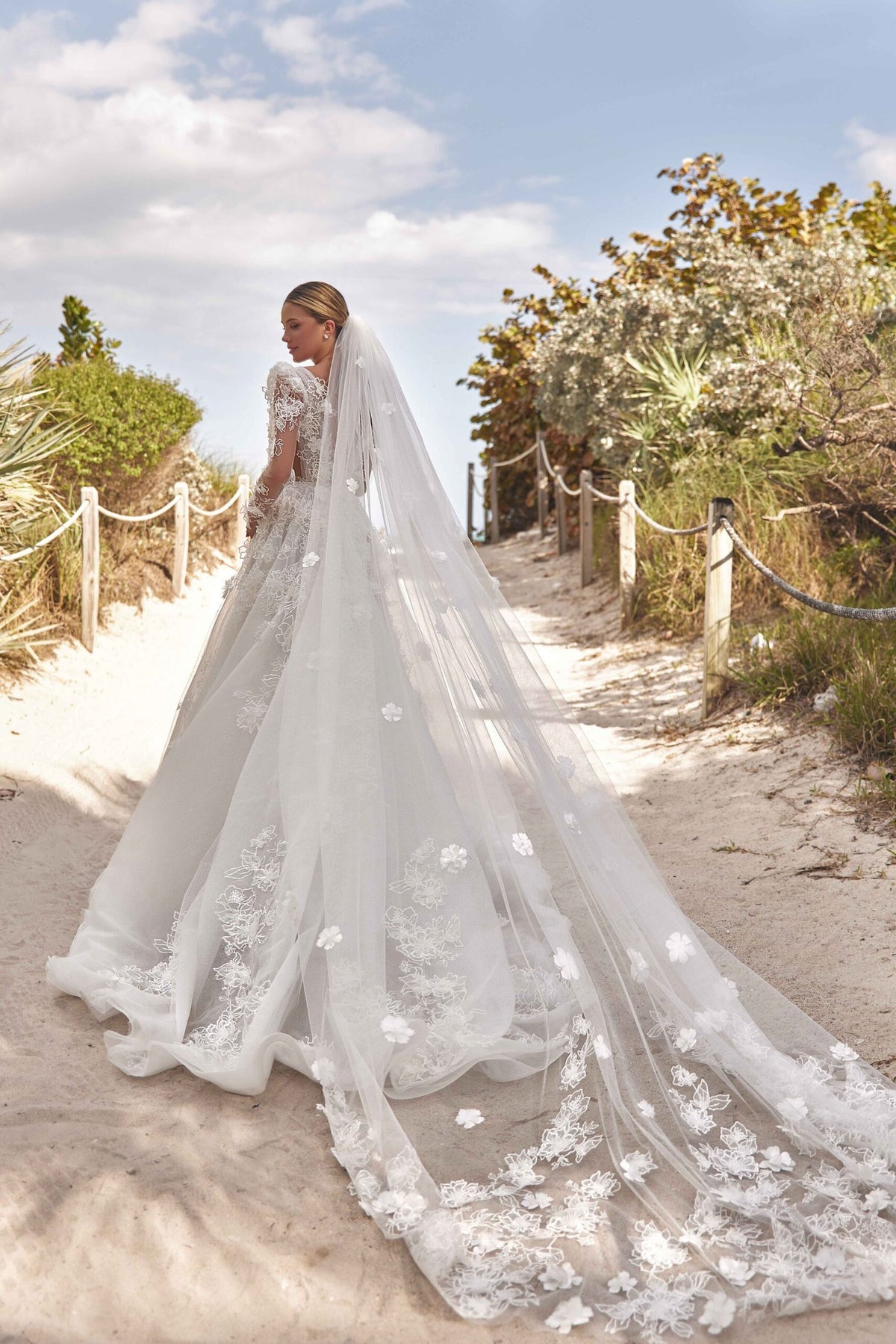 Lightweight yet striking, ASTRA VEIL frames the bride with subtle sophistication, elevating the gown without overpowering it.