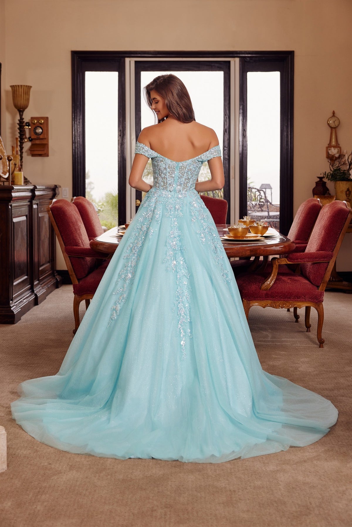 STUNNING BALL GOWN FEATURING OFF SHOULDER STRAPS AND A PLUNGING V NECKLINE WITH A SHEER BONED WAISTLINE FULLY EMBROIDERED BODICE BACK ZIPPER AND A COURT TRAIN