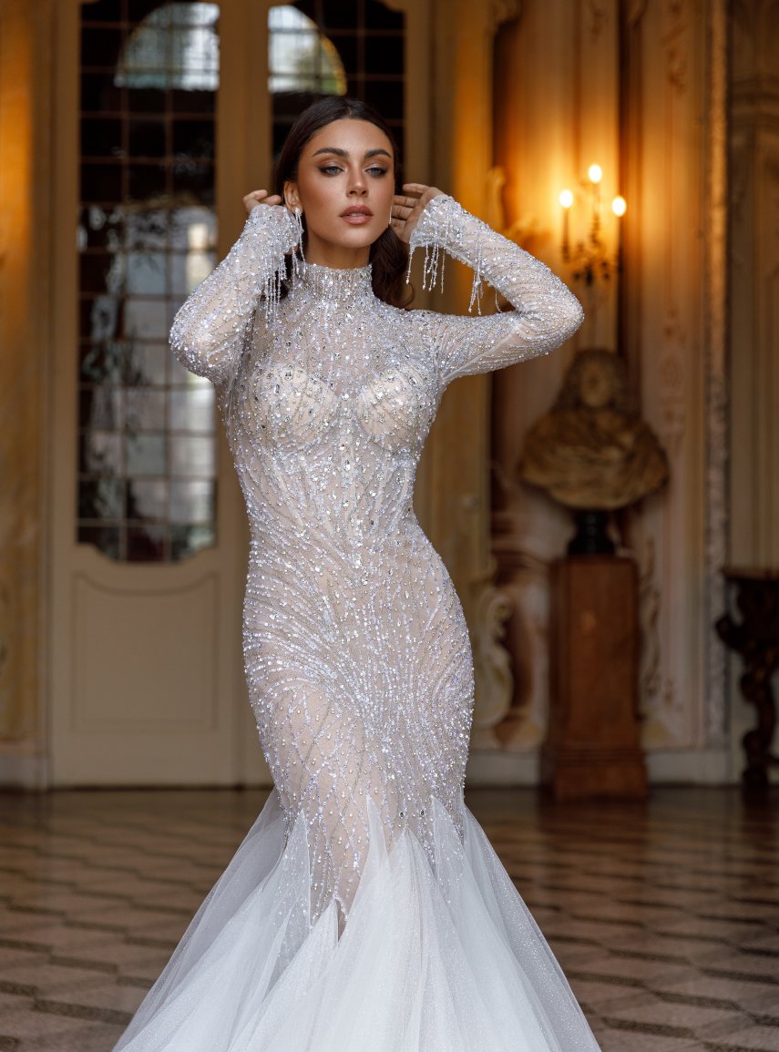 Dresses of Mermaid silhouette with long sleeves. Bodice with inner corset, with cups, open back, zipper. Train length 50 cm. Transparent dress. Decor -embroidery with SW crystals and beads. The main material is lace, tulle with glitter.